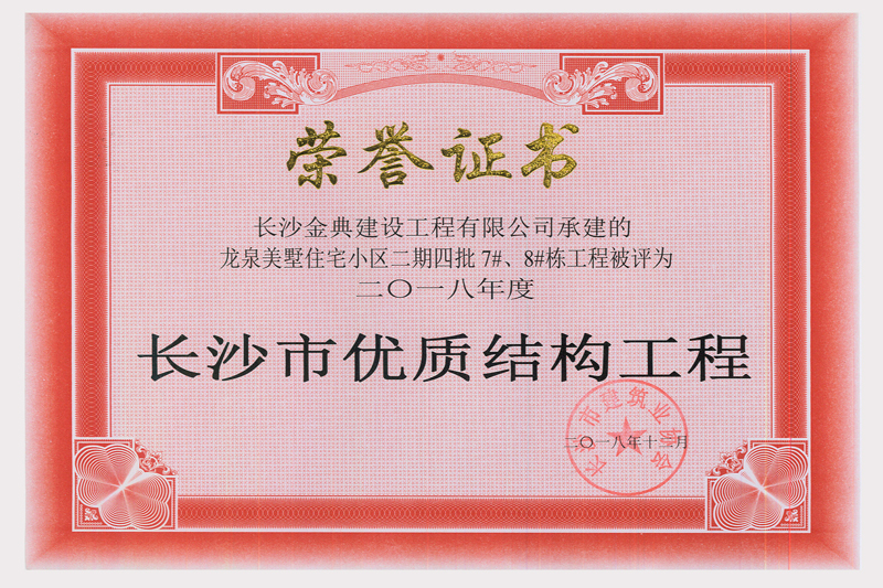 龍泉美墅項目二期四批7、8#棟榮獲“長沙市優質結構工程”獎