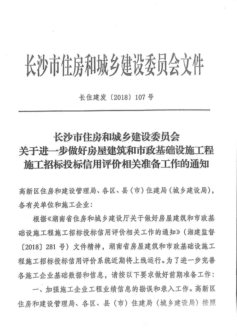 關(guān)于進(jìn)一步做好房屋建筑和市政基礎(chǔ)設(shè)施工程施工招投標(biāo)信用評價(jià)相關(guān)準(zhǔn)備工作的通知(長住建發(fā)(2018)107號)